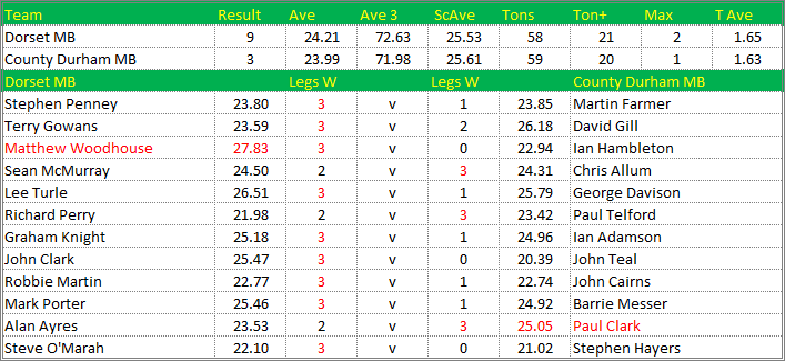 The second half of the Men's A match would see Dorset's England International Scott Mitchell (Lytchett) take to the stage to have the honour of sealing the match win. A solid performance winning 4-1 (26.35) would take the win and the bonus points. Despite best endeavours from the home players, Kevin Smith (Poole) 3-4 (24.81), Steve Earley (Boscombe) 1-4 (25.84) and Mark Grimes 3-4 (Christchurch) the next three matches went to the visitors. A late rally from the last two Dorset men Dale Masterman (Lytchett) 4-2 (23.06) and Thomas Chant (Blandford) 4-0 (22.02) would give the home team a fantastic 21-15 triumph.