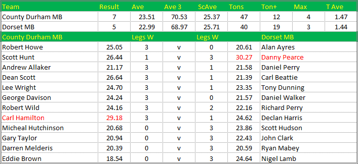 Up first Alan Ayres. Alan despite hitting a 20.61 average lost to Rob Howe (25.05) 0-3. Next for Dorset one of our NEWBEE'S Danny Pearce who had an amazing game against County Durham's Scott Hunt (26.44) Danny winning 3-0 with a 30.25 average and no surprise with an average like that was our man of the match, then losses for Dan Perry, Carl Beattie, Tony Dunning, Dan Walker put Dorset 1-5 down. Richard Perry on next took his match to a deciding leg which didn't go his way. Declan Harris despite hitting a 24.62 average lost 1-3 to County Durham's man of the match Carl Hamilton who banged in a 29.18 average, putting Dorset 1-7 down with 4 to play. Next four matches Dorset didn't lose a leg with wins for Scott Hudson, John Clark, Ryan Mabey (newbee) and Nigel Lamb returning to his winning ways, so a great recovery for our Men's B going from 1-7 down to 5-7 so after day one a fair result both teams on 9 games each and ALL to play for tomorrow.