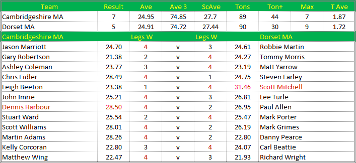 Declan Harris(24.32) v Iain Styles (24.05) what a close cracking game this was. All of the first 6 legs went AGAINST the throw most unusual. Declan with throw starts with a 47 o dear but after that threw some tremendous darts poking out 98 in two darts for a 14 dart winning leg. A very emotional Declan more than a little pleased with his win. Next up Matt Read (23.84) v Will Harwood (26.03) close first leg both missing doubles leg going to Will. After 9 darts Will is on 41 and takes the 2nd. 15 dart leg for Will in the 3rd. Matt misses 3 darts at double 2 (yes it happens) Cambridgeshire take the 4-0 win. Graham Inniss (25.70) up next well out scored Cambridgeshire's Paul Wenn (25.12) so much red pen but this game is all about the double and Graham loses 2-4. Roy Pidgeon up next first to admit he had a lucky draw winning 4-0 with a 20.45 average BUT gets the important WIN that's all that really matters. Scott Hutson (24.56) v Terry Redhead (27.30) what a good game this was to watch. Scott goes into a 2-0 lead then Terry seemed to go up a gear, and takes the 4-2 win, and was Cambridgeshire's Man of the Match. Up last Nigel Lamb (24.47) Nigel back in the team. Nigel takes the first leg but numerous missed doubles and he loses 1-4